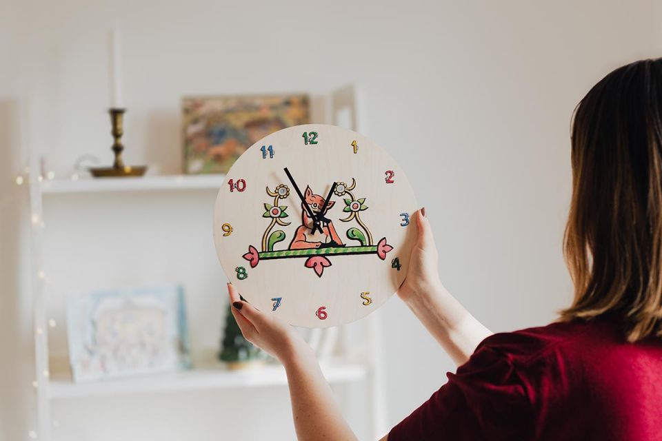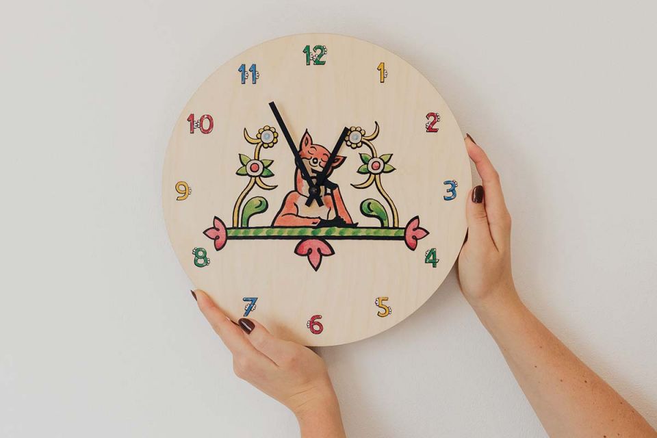 Drewniany zegar z motywem Mądrej kumoszki lisicy wprowadza do wnętrza bajkowy spokój i odrobinę sprytu. Josef Lada stworzył tę postać na podstawie czeskich baśni – jego lisica jest piękna, mądra i pełna charakterystycznego, ciepłego uroku.